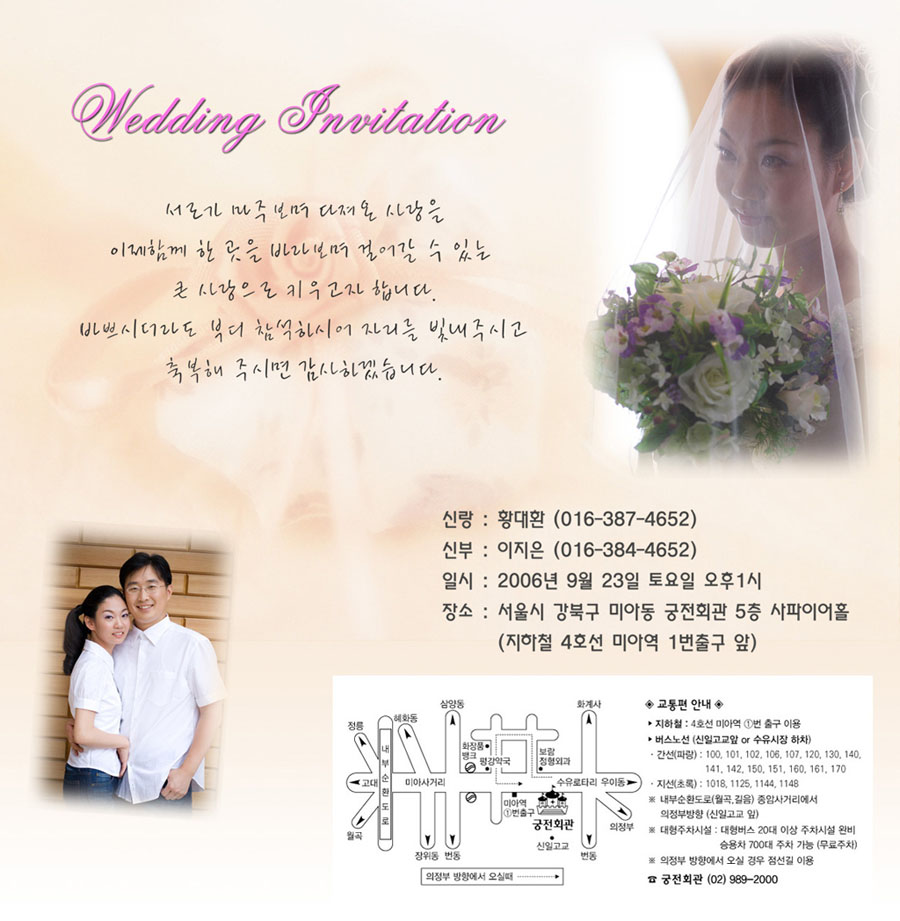 미분류저희 결혼식 청첩장입니다. 많이들 오셔서 축하해 주세요~~~ ^^ 2006년 09월 02일 오셔서 축하해 주실꺼죠? ^^ Previous [2006.08.19] 예단 들이기..... ^^ Newer 결혼식 사진 (신부대기실) Leave a Reply 응답 취소이메일 주소는 공개되지 않습니다. 필수 필드는 *로 표시됩니다이름 * 이메일 * 웹사이트 다음 번 댓글 작성을 위해 이 브라우저에 이름, 이메일, 그리고 웹사이트를 저장합니다.Comment